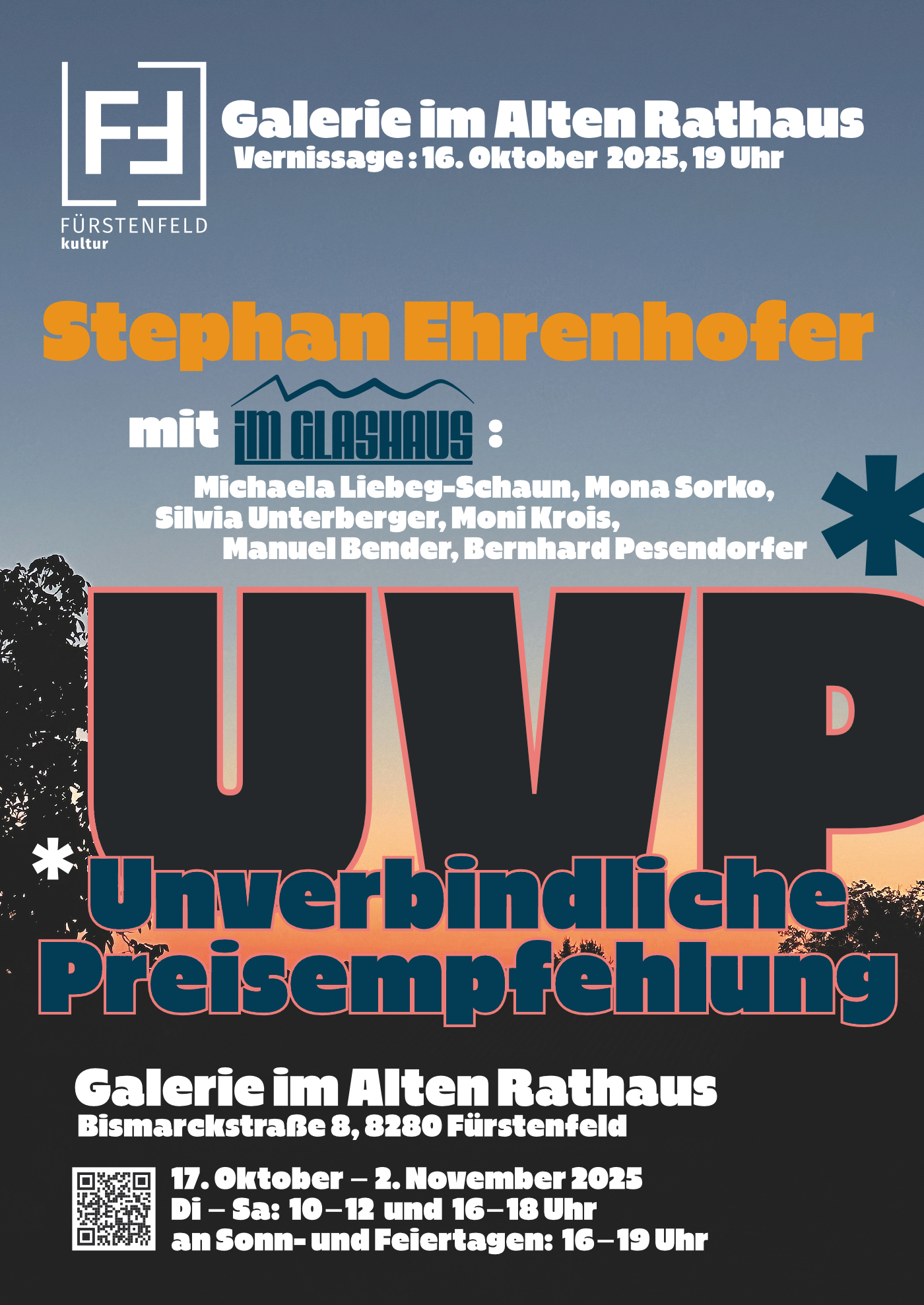 Die nun in Fürstenfeld eingerichtete Ausstellung "UVP / Unverbindliche Preisempfehlung" zeigt eine besondere Auswahl an Arbeiten von Stephan Ehrenhofer in direkter Gegenüberstellung mit floristischen Interventionen der Gruppe "im Glashaus" aus der Steiermark und dem Südburgenland.